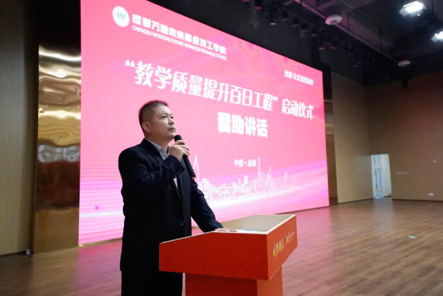 启动仪式在庄严的国歌声中拉开帷幕。成都万通党支部书记周主任在开幕致辞中深刻阐述了开展“百日工程”的重要意义。他指出,在当前国家大力发展新质生产力、对高素质技术技能人才需求日益迫切的背景下,教学质量是学校的生命线,是立校之本、强校之基。“本次‘百日工程’不仅是一次阶段性的攻坚行动,更是学校迈向高质量发展新征程的宣言。我们必须以‘百日’促‘百年’,通过全员、全过程、全方位的质量提升,夯实学生成才的基石,回应社会与家长的期待。”