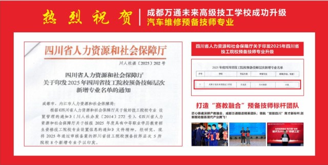 根据《四川省人力资源和社会保障厅关于同意设立成都万通未来高级技工学校的批复》(川人社函〔2025〕202号)及相关专业设置评估要求,经学校申报、材料审核、专家实地评审与综合评议,成都万通未来高级技工学校汽车维修专业顺利通过评审,成功升级为汽车维修预备技师专业。