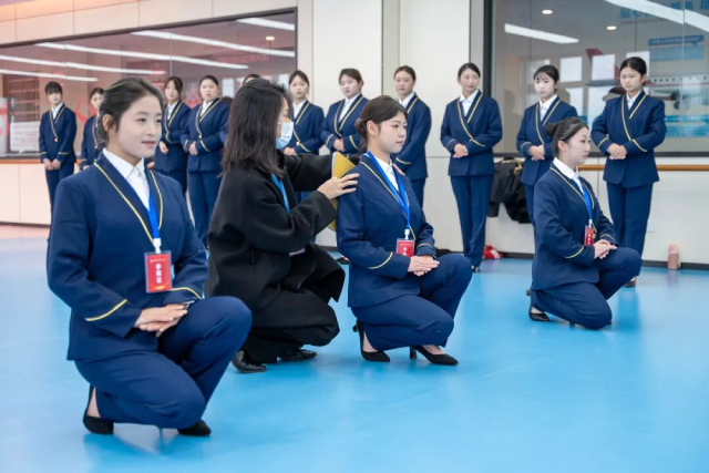 如果说笔试考察的是“内功”,那么形体礼仪竞赛环节则是一场视觉的盛宴。在模拟机舱和高铁车厢的实训基地内,学生们身着统一的职业制服,分组展示了标准的站姿、坐姿、走姿、蹲姿以及指引、问候等手势礼仪。他们妆容得体,微笑亲切,一举一动都彰显着城轨航空从业人员的专业与优雅。评委们从职业形象、表情管理、动作规范及团队默契等多个维度进行严格评分,并对细节进行精准指导。