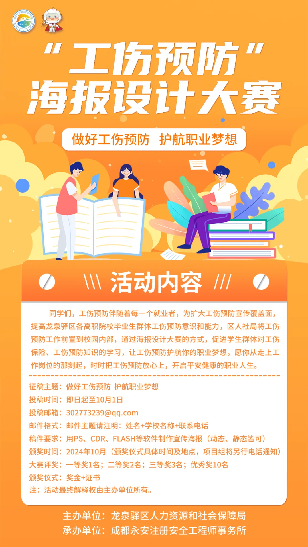 请参赛学生结合学校专业特色,并围绕安全防护用具的规范使用、安全事故频发的案例现场、工伤认定的情形、重点行业重点岗位的工伤预防措施等方面进行“工伤预防”海报创意设计。